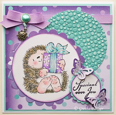 Afijn, nu ga ik even de kaart omschrijven met wat voor materiaal ik ze gemaakt heb. Ik had hier erg veel plezier in het maken omdat ik verschillende technieken gebruikt heb. De beer is een stempel van Penny Black `Joie de Vivre`en heb ik later na het inkleuren met de potloden uitgeknipt. Omdat er aan de ballonnen van die dunne draadjes hangen en niet meevalt om dat uit te knippen heb ik er later gewoon draadjes van garen eraan gedaan, zo lijkt het net echt touw. De achtergrond heb ik door de cuttlebug gehaald en laat ik zo de bloemen terugkomen die ook in het papier zitten. Nu weet ik toch niet meer van welk merk het papier is. Dit komt omdat ik de kaart al een tijdje heb liggen, ik had ze al voor de beurs in Den Bosch gemaakt. Ik had al het papier opgemaakt (lol). Het is ook zo`n vrolijke lijn. Het blauwe randje is gemaakt van een Martha Stewart randpons. Het gras is ook van MS `Grass`en heb ik 2 keer geponst. Ik heb met een kleine bloemenpons `Carl`van Carla Craft de bloementjes uit het scrappapier gehaald en er tussen geplakt. Zo heb ik dat ook met de beer gedaan en lijkt het of dat ie echt in het gras loopt. Dan bleef de strik nog over met de tekst van TPC Studio.